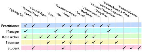 OOPSLA offers 15 submission areas. That's an intimidating number of options if you've never been to OOPSLA. To help you decide on the most appropriate area for your contribution we've prepared the following table. Pick the row on the left that best describes you. Columns titles on the right list submission areas. The tick marks show which areas are most likely relevant for a given role. Of course, you are welcome to submit to any venue.